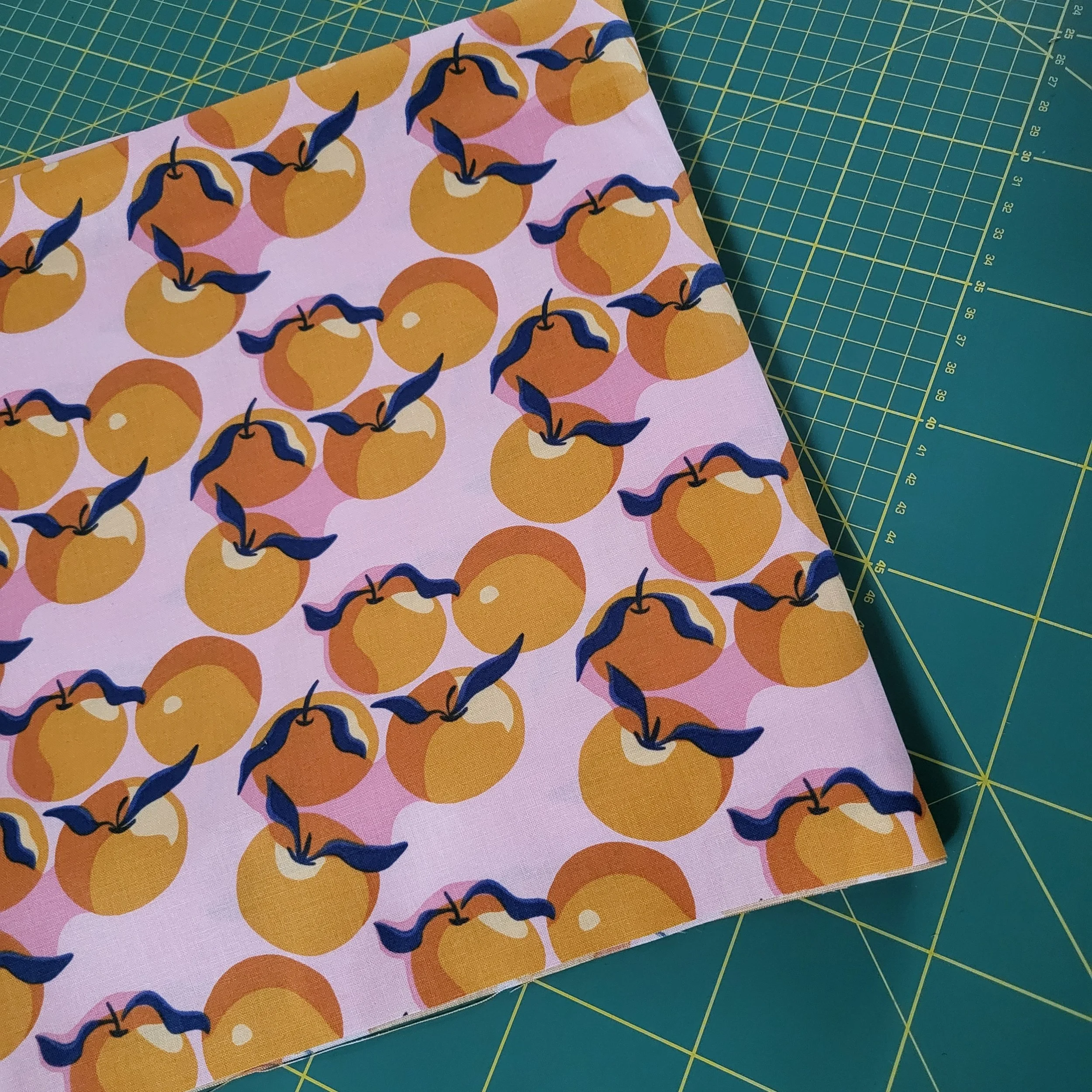 This Cloud9 Fabrics quilting cotton is from the Comforts of Home Range. It features clementines against a pink background.